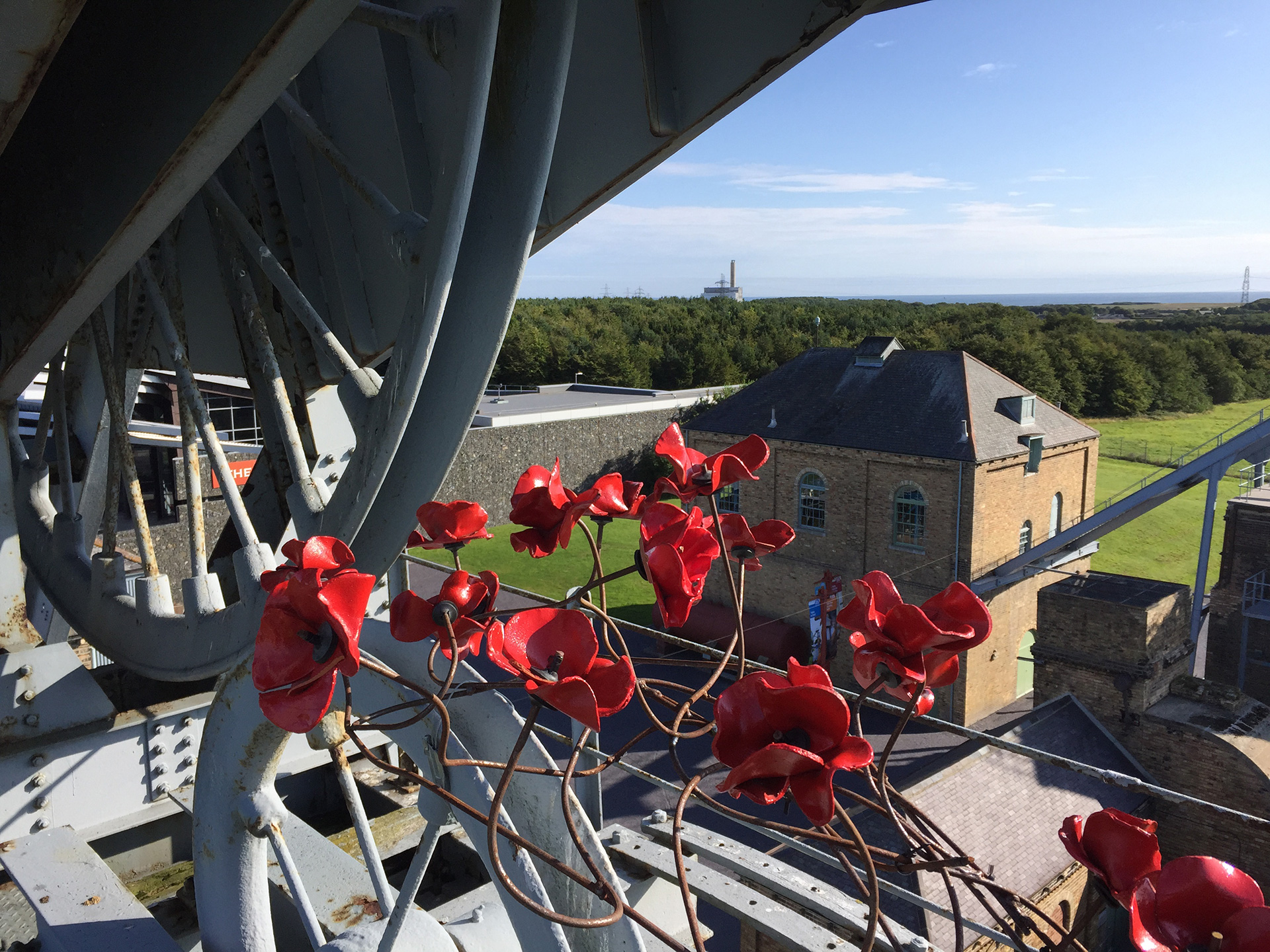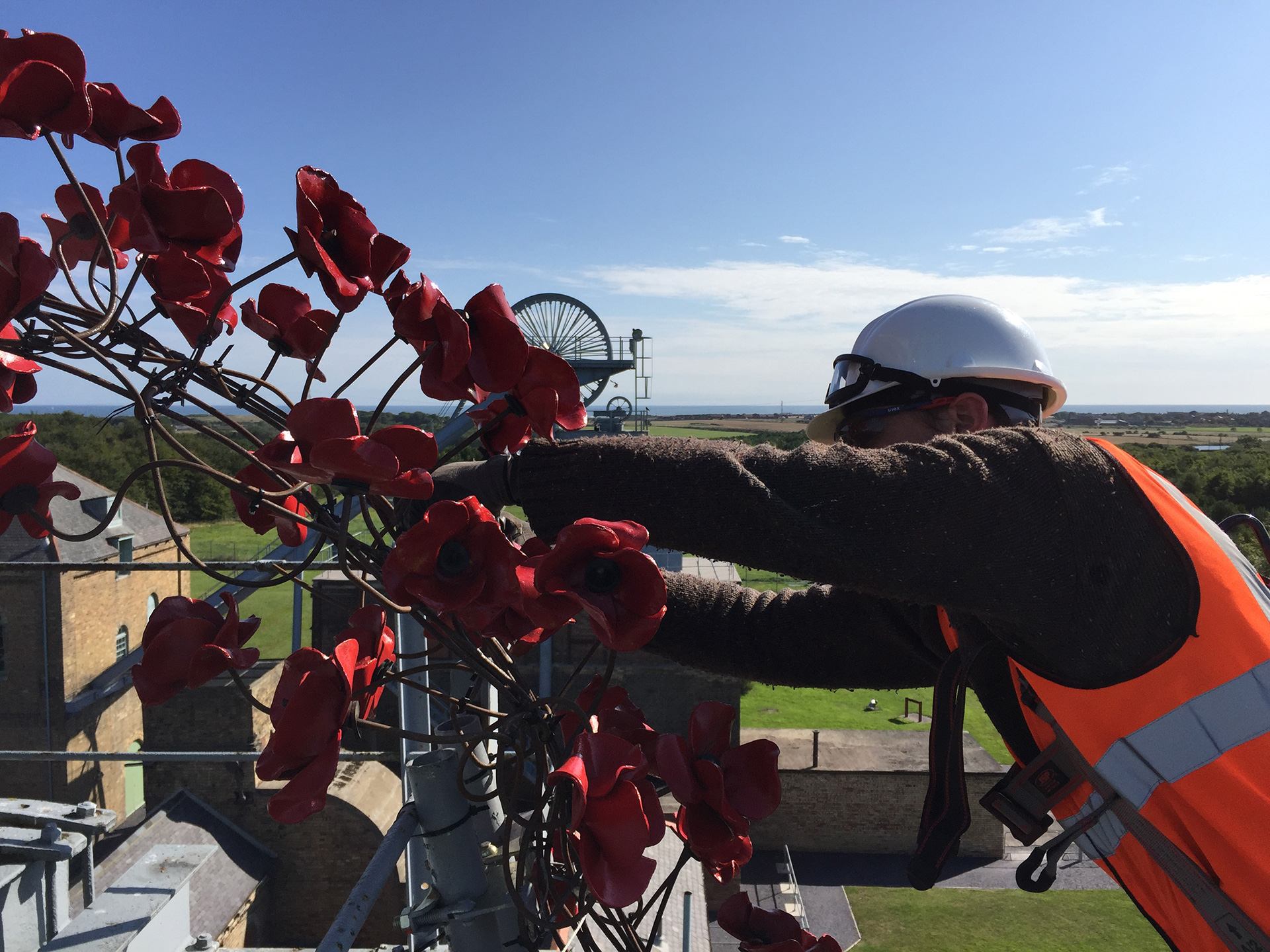 A complex installation for the first venue to host a tour of the 5,000 ceramic poppies, originally displayed at the Tower of London, to mark the centenary of World War 1. At Woodhorn Museum they were to cascade from the top of the Pit Wheel.